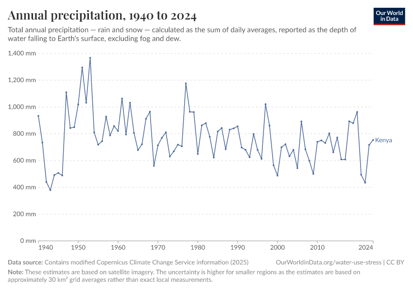 “Data Page: Annual precipitation”, part of the following publication: Hannah Ritchie, Pablo Rosado, and Veronika Samborska (2024) - “Climate Change”. Data adapted from Contains modified Copernicus Climate Change Service information. Retrieved from https://archive.ourworldindata.org/20251027-111021/grapher/average-precipitation-per-year.html [online resource] (archived on October 27, 2025).