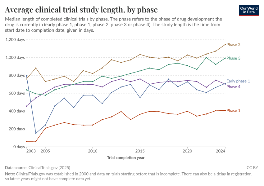 ClinicalTrials.gov (2025) – with major processing by Our World in Data. “Average clinical trial study length, by phase” [dataset]. ClinicalTrials.gov, “Clinical Trials (ClinicalTrials.gov)” [original data]. Retrieved December 5, 2025 from https://archive.ourworldindata.org/20251030-181109/grapher/average-study-length-by-phase.html (archived on October 30, 2025).