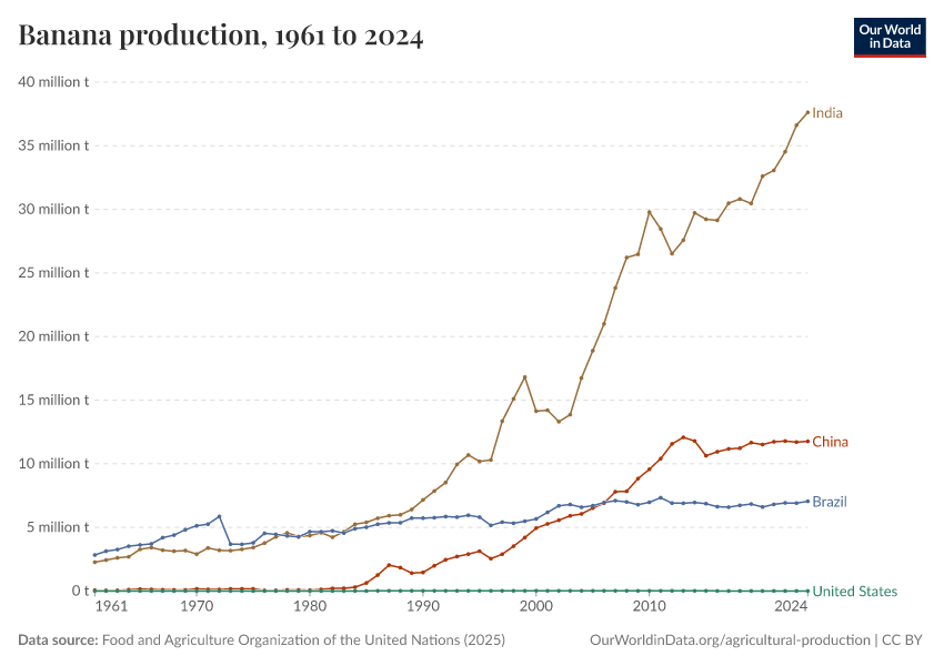 Food and Agriculture Organization of the United Nations (2025) – with major processing by Our World in Data. “Banana production – UN FAO” [dataset]. Food and Agriculture Organization of the United Nations, “Production: Crops and livestock products” [original data]. Retrieved April 29, 2026 from https://archive.ourworldindata.org/20260417-112857/grapher/banana-production.html (archived on April 17, 2026).Download