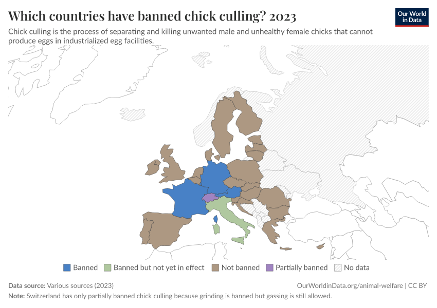Various sources (2023) – with minor processing by Our World in Data. “Which countries have banned chick culling?” [dataset]. Various sources, “Chick culling laws” [original data]. Retrieved February 7, 2026 from https://archive.ourworldindata.org/20250909-093708/grapher/banning-of-chick-culling.html (archived on September 9, 2025).