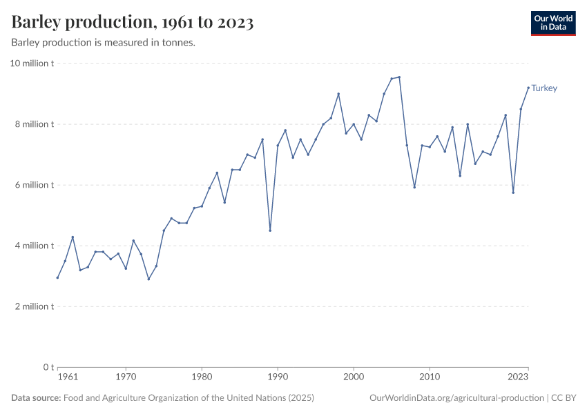 “Data Page: Barley production”, part of the following publication: Hannah Ritchie, Pablo Rosado, and Max Roser (2023) - “Agricultural Production”. Data adapted from Food and Agriculture Organization of the United Nations. Retrieved from https://archive.ourworldindata.org/20251014-161652/grapher/barley-production.html [online resource] (archived on October 14, 2025).How to cite this data