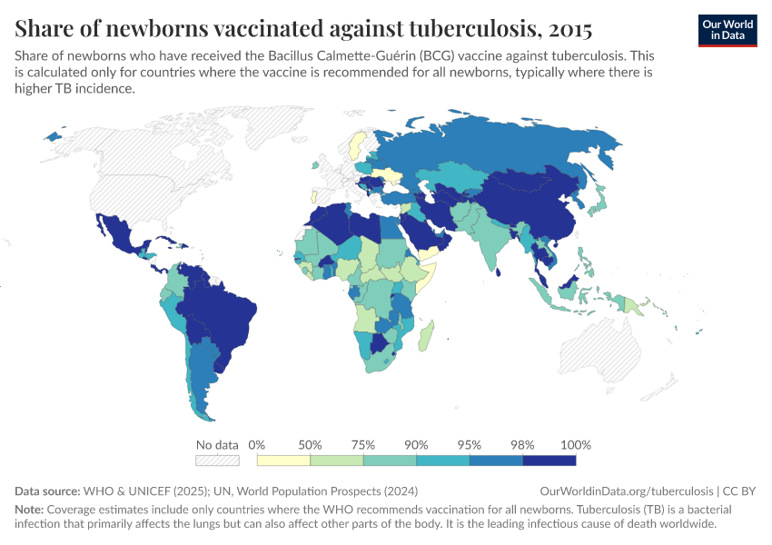 WHO & UNICEF (2025); UN, World Population Prospects (2024) – processed by Our World in Data. “Share of newborns vaccinated against tuberculosis” [dataset]. WHO & UNICEF, “WHO Immunization Data - Vaccination coverage”; United Nations, “World Population Prospects” [original data]. Retrieved January 11, 2026 from https://archive.ourworldindata.org/20250929-104429/grapher/bcg-immunization-coverage-for-tb-among-1-year-olds.html (archived on September 29, 2025).