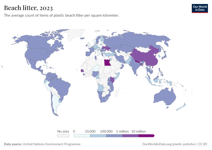 “Data Page: Beach litter”. Our World in Data (2026). Data adapted from United Nations Environment Programme. Retrieved from https://archive.ourworldindata.org/20260330-194822/grapher/beach-litter.html [online resource] (archived on March 30, 2026).How to cite this data