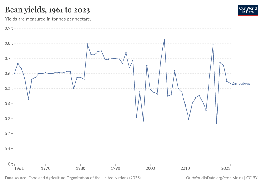 Food and Agriculture Organization of the United Nations (2025) – with major processing by Our World in Data. “Bean yields – UN FAO” [dataset]. Food and Agriculture Organization of the United Nations, “Production: Crops and livestock products” [original data]. Retrieved December 6, 2025 from https://archive.ourworldindata.org/20251014-161652/grapher/bean-yields.html (archived on October 14, 2025).
