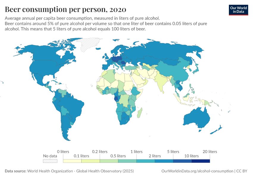 World Health Organization - Global Health Observatory (2025) – processed by Our World in Data. “Beer consumption per person” [dataset]. World Health Organization, “Global Health Observatory” [original data]. Retrieved April 6, 2026 from https://archive.ourworldindata.org/20260304-094028/grapher/beer-consumption-per-person.html (archived on March 4, 2026).Download
