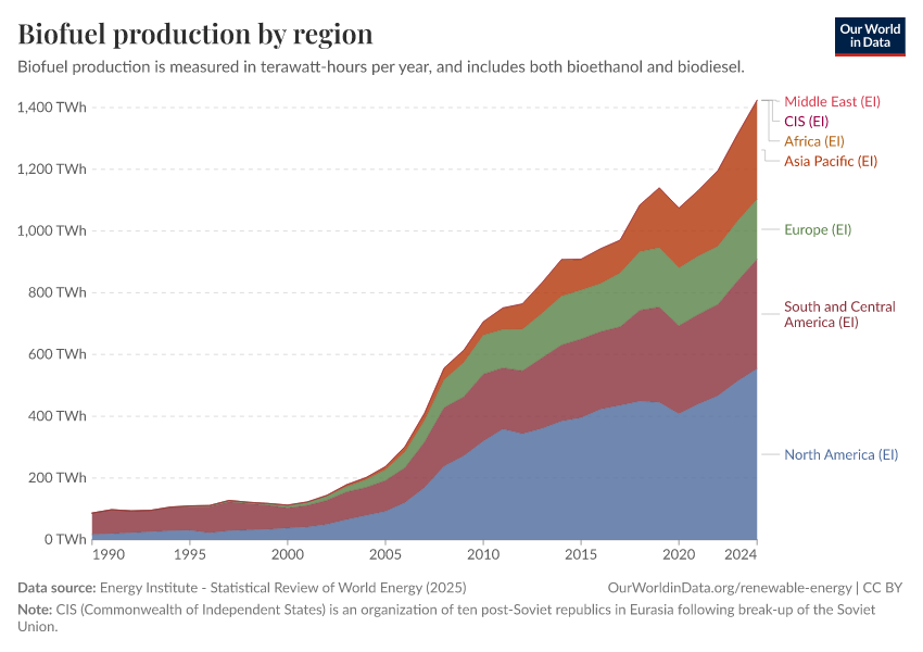 Energy Institute - Statistical Review of World Energy (2025) – with major processing by Our World in Data. “Biofuels production” [dataset]. Energy Institute, “Statistical Review of World Energy” [original data]. Retrieved January 12, 2026 from https://archive.ourworldindata.org/20250909-093708/grapher/biofuels-production-by-region.html (archived on September 9, 2025).