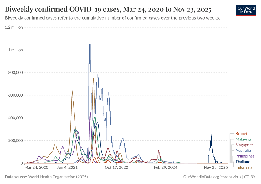 World Health Organization (2025) – processed by Our World in Data. “Biweekly confirmed COVID-19 cases” [dataset]. World Health Organization, “COVID-19 Dashboard WHO COVID-19 Dashboard - Daily cases and deaths” [original data]. Retrieved December 31, 2025 from https://archive.ourworldindata.org/20251231-063342/grapher/biweekly-confirmed-covid-19-cases.html (archived on December 31, 2025).