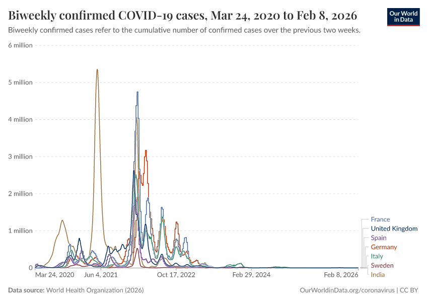 World Health Organization (2026) – processed by Our World in Data. “Biweekly confirmed COVID-19 cases” [dataset]. World Health Organization, “COVID-19 Dashboard WHO COVID-19 Dashboard - Daily cases and deaths” [original data]. Retrieved March 3, 2026 from https://archive.ourworldindata.org/20260303-063353/grapher/biweekly-confirmed-covid-19-cases.html (archived on March 3, 2026).