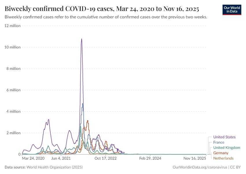 World Health Organization (2025) – processed by Our World in Data. “Biweekly confirmed COVID-19 cases” [dataset]. World Health Organization, “COVID-19 Dashboard WHO COVID-19 Dashboard - Daily cases and deaths” [original data]. Retrieved December 6, 2025 from https://archive.ourworldindata.org/20251206-063317/grapher/biweekly-confirmed-covid-19-cases.html (archived on December 6, 2025).