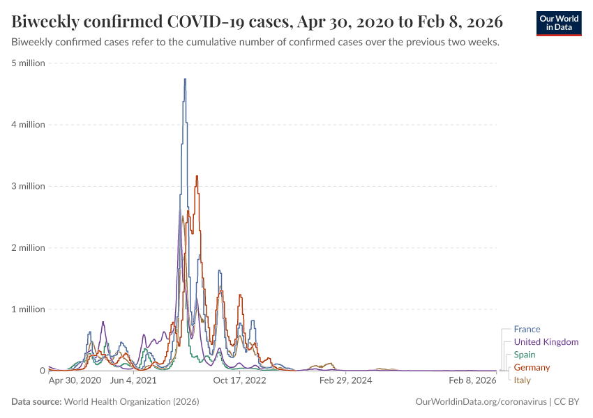 World Health Organization (2025) – processed by Our World in Data. “Biweekly confirmed COVID-19 cases” [dataset]. World Health Organization, “COVID-19 Dashboard WHO COVID-19 Dashboard - Daily cases and deaths” [original data]. Retrieved December 12, 2025 from https://archive.ourworldindata.org/20251212-063335/grapher/biweekly-confirmed-covid-19-cases.html (archived on December 12, 2025).