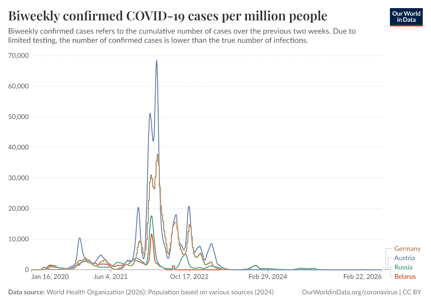 World Health Organization (2026); Population based on various sources (2024) – with minor processing by Our World in Data. “Biweekly confirmed COVID-19 cases per million people” [dataset]. World Health Organization, “COVID-19 Dashboard WHO COVID-19 Dashboard - Daily cases and deaths”; Various sources, “Population” [original data]. Retrieved April 14, 2026 from https://archive.ourworldindata.org/20260414-063332/grapher/biweekly-covid-cases-per-million-people.html (archived on April 14, 2026).Download