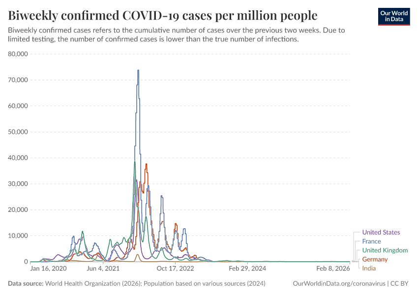 World Health Organization (2026); Population based on various sources (2024) – with minor processing by Our World in Data. “Biweekly confirmed COVID-19 cases per million people” [dataset]. World Health Organization, “COVID-19 Dashboard WHO COVID-19 Dashboard - Daily cases and deaths”; Various sources, “Population” [original data]. Retrieved March 3, 2026 from https://archive.ourworldindata.org/20260303-063353/grapher/biweekly-covid-cases-per-million-people.html (archived on March 3, 2026).