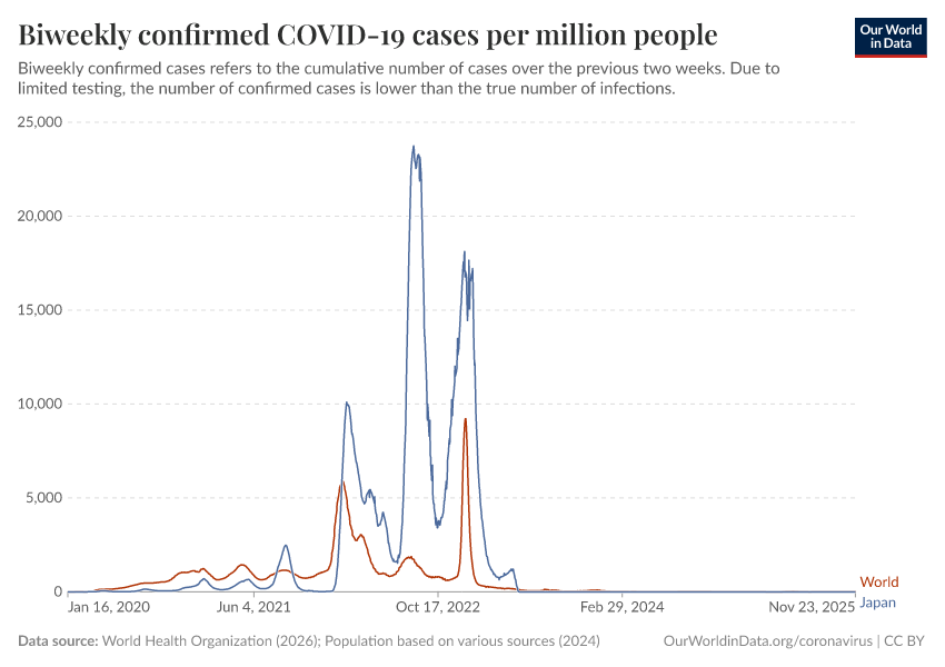 World Health Organization (2026); Population based on various sources (2024) – with major processing by Our World in Data. “Biweekly confirmed COVID-19 cases per million people” [dataset]. World Health Organization, “COVID-19 Dashboard WHO COVID-19 Dashboard - Daily cases and deaths”; Various sources, “Population” [original data]. Retrieved January 2, 2026 from https://archive.ourworldindata.org/20260101-063338/grapher/biweekly-covid-cases-per-million-people.html (archived on January 1, 2026).