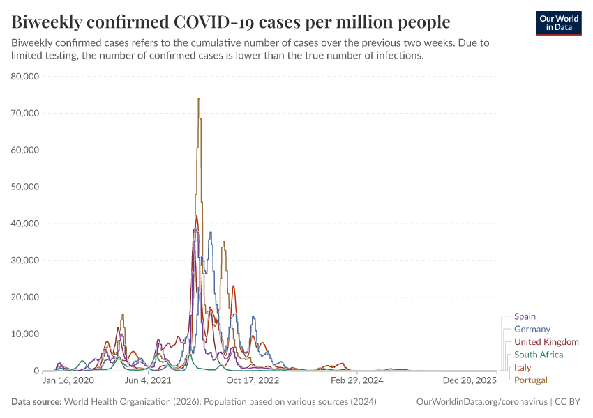 “Data Page: Biweekly confirmed COVID-19 cases per million people”, part of the following publication: Edouard Mathieu, Hannah Ritchie, Lucas Rodés-Guirao, Cameron Appel, Daniel Gavrilov, Charlie Giattino, Joe Hasell, Bobbie Macdonald, Saloni Dattani, Diana Beltekian, Esteban Ortiz-Ospina, and Max Roser (2020) - “COVID-19 Pandemic”. Data adapted from World Health Organization, Various sources. Retrieved from https://archive.ourworldindata.org/20260115-063318/grapher/biweekly-covid-cases-per-million-people.html [online resource] (archived on January 15, 2026).