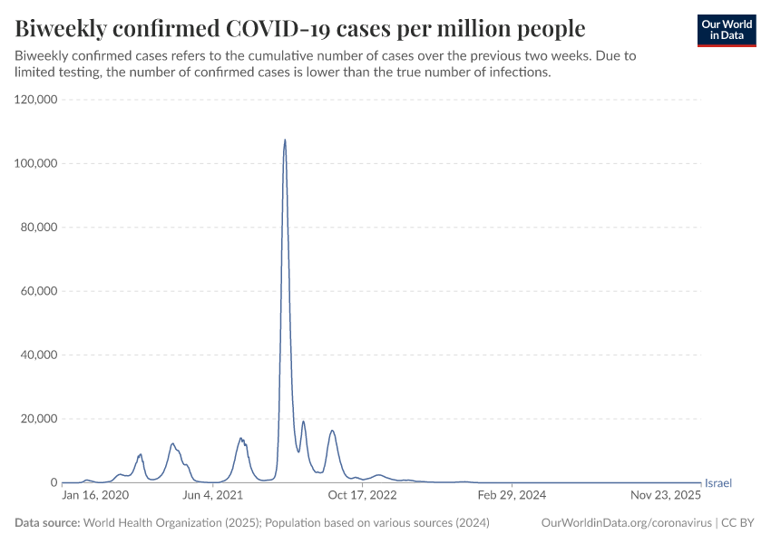 World Health Organization (2025); Population based on various sources (2024) – with major processing by Our World in Data. “Biweekly confirmed COVID-19 cases per million people” [dataset]. World Health Organization, “COVID-19 Dashboard WHO COVID-19 Dashboard - Daily cases and deaths”; Various sources, “Population” [original data]. Retrieved December 22, 2025 from https://archive.ourworldindata.org/20251222-063248/grapher/biweekly-covid-cases-per-million-people.html (archived on December 22, 2025).