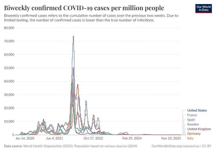 World Health Organization (2025); Population based on various sources (2024) – with major processing by Our World in Data. “Biweekly confirmed COVID-19 cases per million people” [dataset]. World Health Organization, “COVID-19 Dashboard WHO COVID-19 Dashboard - Daily cases and deaths”; Various sources, “Population” [original data]. Retrieved December 11, 2025 from https://archive.ourworldindata.org/20251211-063340/grapher/biweekly-covid-cases-per-million-people.html (archived on December 11, 2025).