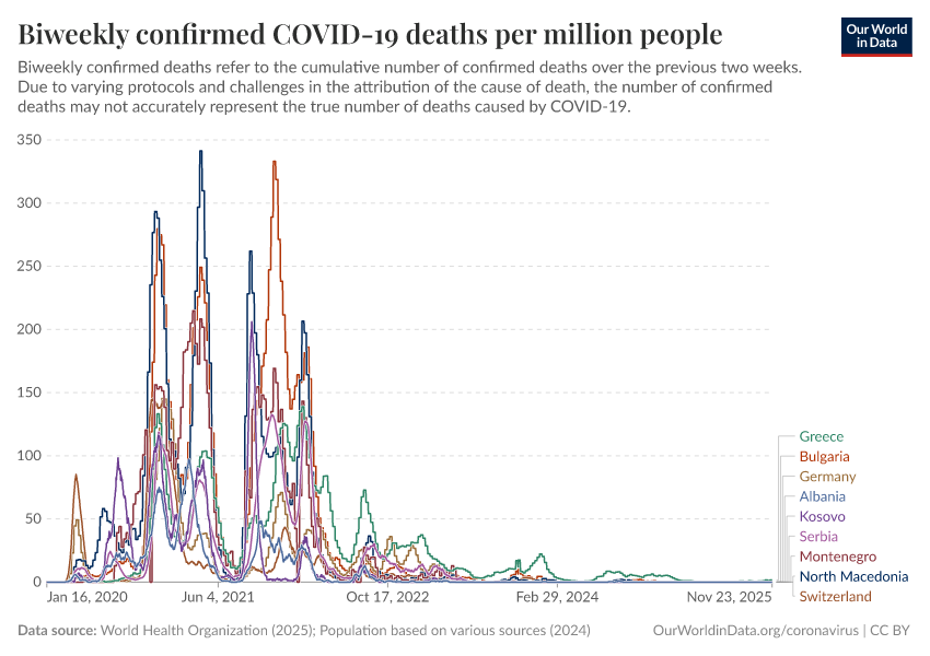 World Health Organization (2025); Population based on various sources (2024) – with major processing by Our World in Data. “Biweekly confirmed COVID-19 deaths per million people” [dataset]. World Health Organization, “COVID-19 Dashboard WHO COVID-19 Dashboard - Daily cases and deaths”; Various sources, “Population” [original data]. Retrieved December 15, 2025 from https://archive.ourworldindata.org/20251214-063417/grapher/biweekly-covid-deaths-per-million-people.html (archived on December 14, 2025).