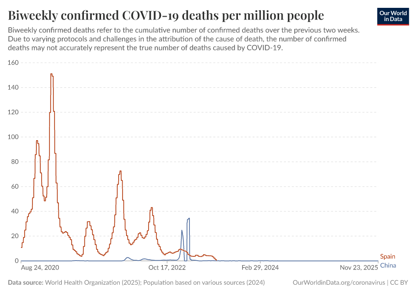 World Health Organization (2025); Population based on various sources (2024) – with major processing by Our World in Data. “Biweekly confirmed COVID-19 deaths per million people” [dataset]. World Health Organization, “COVID-19 Dashboard WHO COVID-19 Dashboard - Daily cases and deaths”; Various sources, “Population” [original data]. Retrieved December 31, 2025 from https://archive.ourworldindata.org/20251231-063342/grapher/biweekly-covid-deaths-per-million-people.html (archived on December 31, 2025).