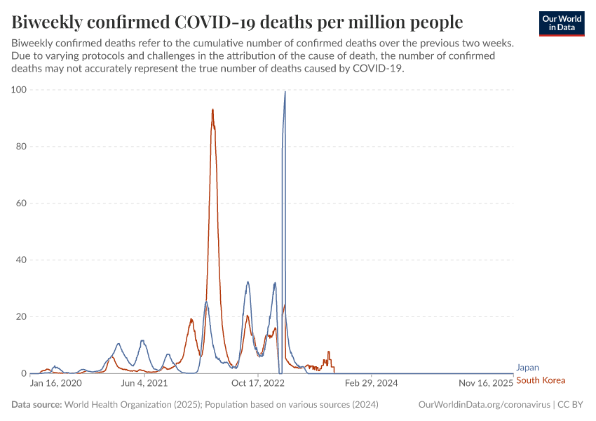 World Health Organization (2025); Population based on various sources (2024) – with major processing by Our World in Data. “Biweekly confirmed COVID-19 deaths per million people” [dataset]. World Health Organization, “COVID-19 Dashboard WHO COVID-19 Dashboard - Daily cases and deaths”; Various sources, “Population” [original data]. Retrieved December 6, 2025 from https://archive.ourworldindata.org/20251205-063407/grapher/biweekly-covid-deaths-per-million-people.html (archived on December 5, 2025).
