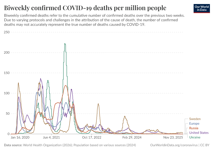 World Health Organization (2026); Population based on various sources (2024) – with major processing by Our World in Data. “Biweekly confirmed COVID-19 deaths per million people” [dataset]. World Health Organization, “COVID-19 Dashboard WHO COVID-19 Dashboard - Daily cases and deaths”; Various sources, “Population” [original data]. Retrieved January 1, 2026 from https://archive.ourworldindata.org/20260101-063338/grapher/biweekly-covid-deaths-per-million-people.html (archived on January 1, 2026).