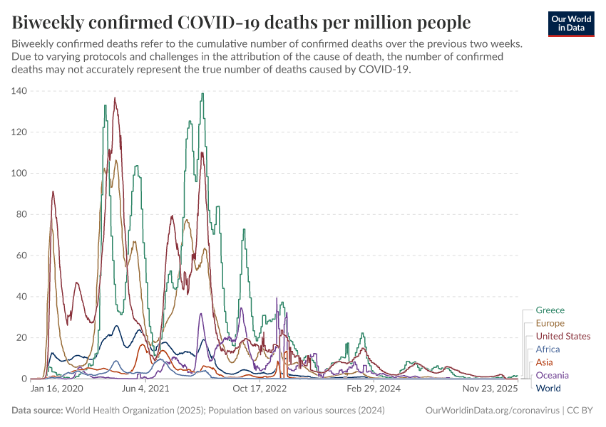 World Health Organization (2025); Population based on various sources (2024) – with major processing by Our World in Data. “Biweekly confirmed COVID-19 deaths per million people” [dataset]. World Health Organization, “COVID-19 Dashboard WHO COVID-19 Dashboard - Daily cases and deaths”; Various sources, “Population” [original data]. Retrieved December 14, 2025 from https://archive.ourworldindata.org/20251214-063417/grapher/biweekly-covid-deaths-per-million-people.html (archived on December 14, 2025).