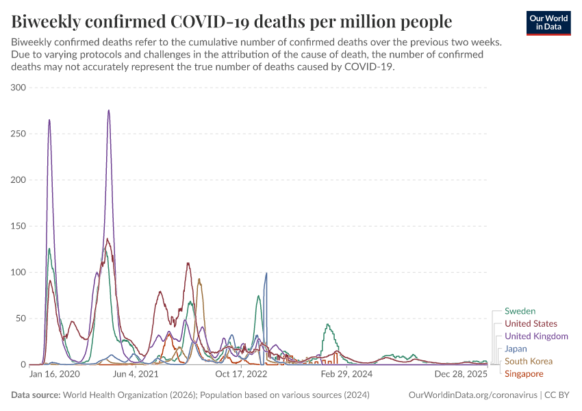World Health Organization (2026); Population based on various sources (2024) – with major processing by Our World in Data. “Biweekly confirmed COVID-19 deaths per million people” [dataset]. World Health Organization, “COVID-19 Dashboard WHO COVID-19 Dashboard - Daily cases and deaths”; Various sources, “Population” [original data]. Retrieved January 15, 2026 from https://archive.ourworldindata.org/20260114-063314/grapher/biweekly-covid-deaths-per-million-people.html (archived on January 14, 2026).
