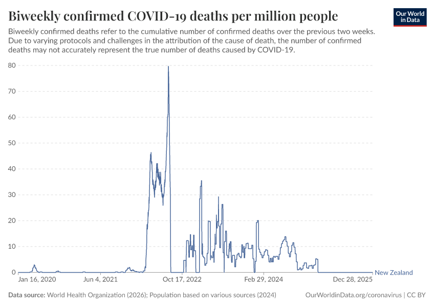 World Health Organization (2026); Population based on various sources (2024) – with major processing by Our World in Data. “Biweekly confirmed COVID-19 deaths per million people” [dataset]. World Health Organization, “COVID-19 Dashboard WHO COVID-19 Dashboard - Daily cases and deaths”; Various sources, “Population” [original data]. Retrieved January 16, 2026 from https://archive.ourworldindata.org/20260116-063306/grapher/biweekly-covid-deaths-per-million-people.html (archived on January 16, 2026).