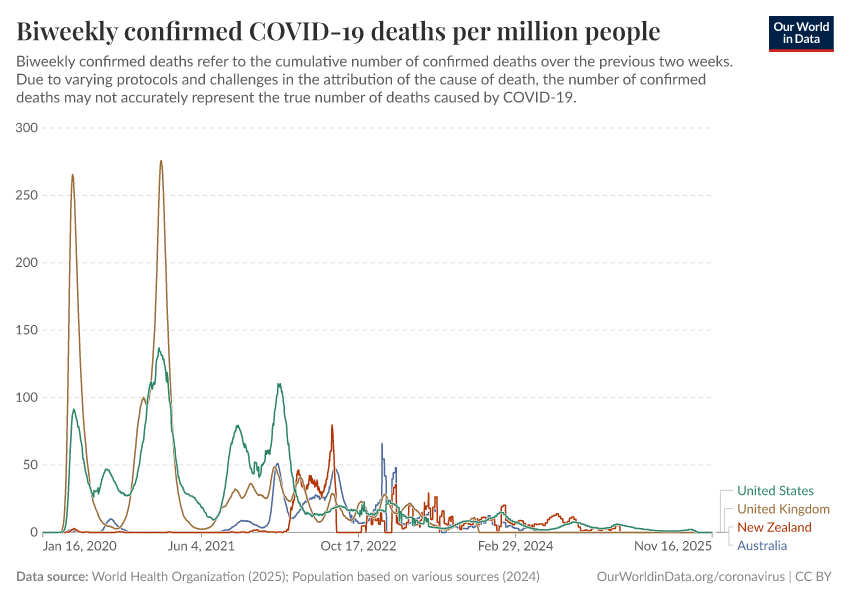World Health Organization (2025); Population based on various sources (2024) – with major processing by Our World in Data. “Biweekly confirmed COVID-19 deaths per million people” [dataset]. World Health Organization, “COVID-19 Dashboard WHO COVID-19 Dashboard - Daily cases and deaths”; Various sources, “Population” [original data]. Retrieved November 10, 2025 from https://archive.ourworldindata.org/20251109-063445/grapher/biweekly-covid-deaths-per-million-people.html (archived on November 9, 2025).