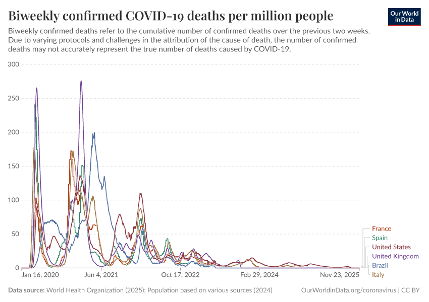 World Health Organization (2025); Population based on various sources (2024) – with major processing by Our World in Data. “Biweekly confirmed COVID-19 deaths per million people” [dataset]. World Health Organization, “COVID-19 Dashboard WHO COVID-19 Dashboard - Daily cases and deaths”; Various sources, “Population” [original data]. Retrieved December 29, 2025 from https://archive.ourworldindata.org/20251229-063330/grapher/biweekly-covid-deaths-per-million-people.html (archived on December 29, 2025).