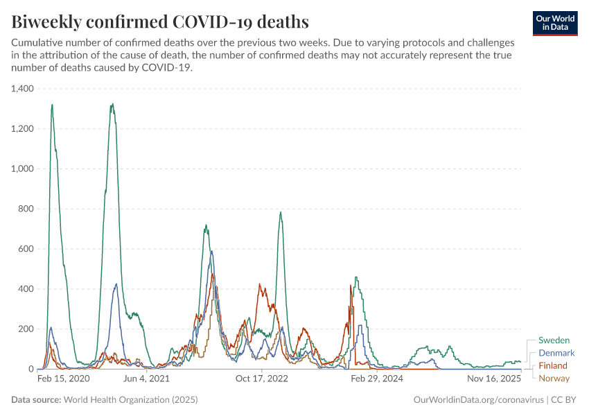 World Health Organization (2025) – processed by Our World in Data. “Biweekly confirmed COVID-19 deaths” [dataset]. World Health Organization, “COVID-19 Dashboard WHO COVID-19 Dashboard - Daily cases and deaths” [original data]. Retrieved December 7, 2025 from https://archive.ourworldindata.org/20251207-063327/grapher/biweekly-covid-deaths.html (archived on December 7, 2025).