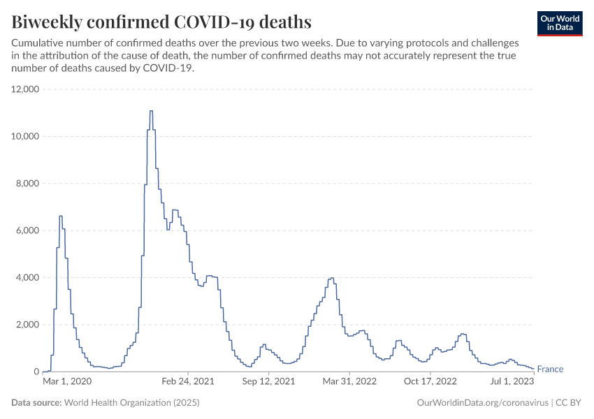World Health Organization (2025) – processed by Our World in Data. “Biweekly confirmed COVID-19 deaths” [dataset]. World Health Organization, “COVID-19 Dashboard WHO COVID-19 Dashboard - Daily cases and deaths” [original data]. Retrieved December 10, 2025 from https://archive.ourworldindata.org/20251210-063403/grapher/biweekly-covid-deaths.html (archived on December 10, 2025).