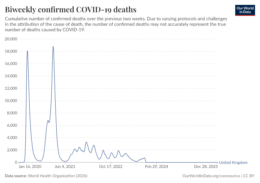 “Data Page: Biweekly confirmed COVID-19 deaths”, part of the following publication: Edouard Mathieu, Hannah Ritchie, Lucas Rodés-Guirao, Cameron Appel, Daniel Gavrilov, Charlie Giattino, Joe Hasell, Bobbie Macdonald, Saloni Dattani, Diana Beltekian, Esteban Ortiz-Ospina, and Max Roser (2020) - “COVID-19 Pandemic”. Data adapted from World Health Organization. Retrieved from https://archive.ourworldindata.org/20260114-063314/grapher/biweekly-covid-deaths.html [online resource] (archived on January 14, 2026).How to cite this data