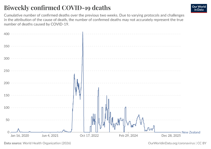 “Data Page: Biweekly confirmed COVID-19 deaths”, part of the following publication: Edouard Mathieu, Hannah Ritchie, Lucas Rodés-Guirao, Cameron Appel, Daniel Gavrilov, Charlie Giattino, Joe Hasell, Bobbie Macdonald, Saloni Dattani, Diana Beltekian, Esteban Ortiz-Ospina, and Max Roser (2020) - “COVID-19 Pandemic”. Data adapted from World Health Organization. Retrieved from https://archive.ourworldindata.org/20260114-063314/grapher/biweekly-covid-deaths.html [online resource] (archived on January 14, 2026).