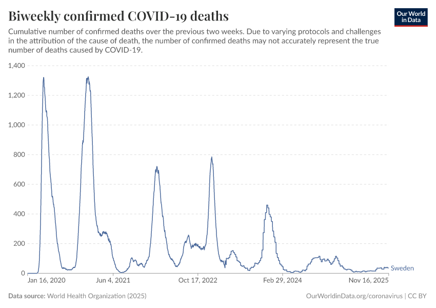 World Health Organization (2025) – processed by Our World in Data. “Biweekly confirmed COVID-19 deaths” [dataset]. World Health Organization, “COVID-19 Dashboard WHO COVID-19 Dashboard - Daily cases and deaths” [original data]. Retrieved December 8, 2025 from https://archive.ourworldindata.org/20251207-063327/grapher/biweekly-covid-deaths.html (archived on December 7, 2025).