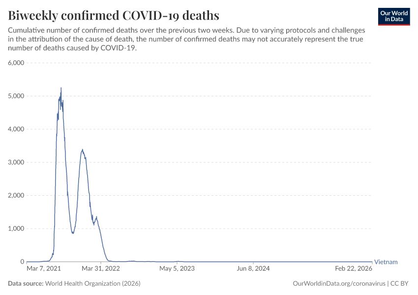 World Health Organization (2026) – processed by Our World in Data. “Biweekly confirmed COVID-19 deaths” [dataset]. World Health Organization, “COVID-19 Dashboard WHO COVID-19 Dashboard - Daily cases and deaths” [original data]. Retrieved March 22, 2026 from https://archive.ourworldindata.org/20260321-063348/grapher/biweekly-covid-deaths.html (archived on March 21, 2026).