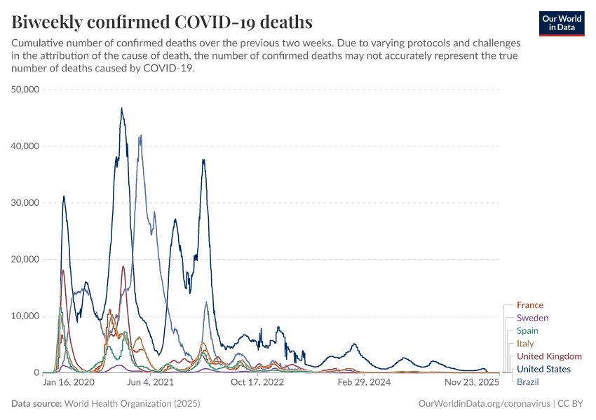 World Health Organization (2025) – processed by Our World in Data. “Biweekly confirmed COVID-19 deaths” [dataset]. World Health Organization, “COVID-19 Dashboard WHO COVID-19 Dashboard - Daily cases and deaths” [original data]. Retrieved December 15, 2025 from https://archive.ourworldindata.org/20251215-063346/grapher/biweekly-covid-deaths.html (archived on December 15, 2025).