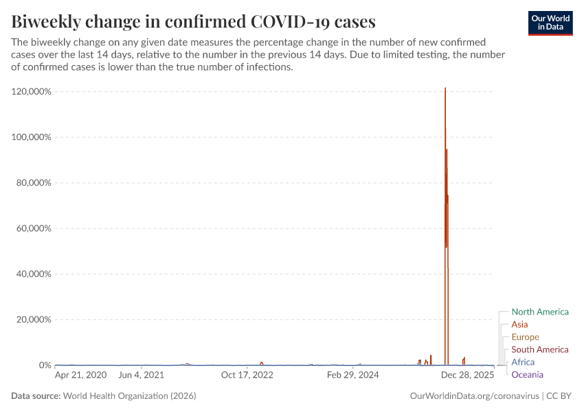 World Health Organization (2026) – processed by Our World in Data. “Biweekly change in confirmed COVID-19 cases” [dataset]. World Health Organization, “COVID-19 Dashboard WHO COVID-19 Dashboard - Daily cases and deaths” [original data]. Retrieved January 15, 2026 from https://archive.ourworldindata.org/20260114-063314/grapher/biweekly-growth-covid-cases.html (archived on January 14, 2026).