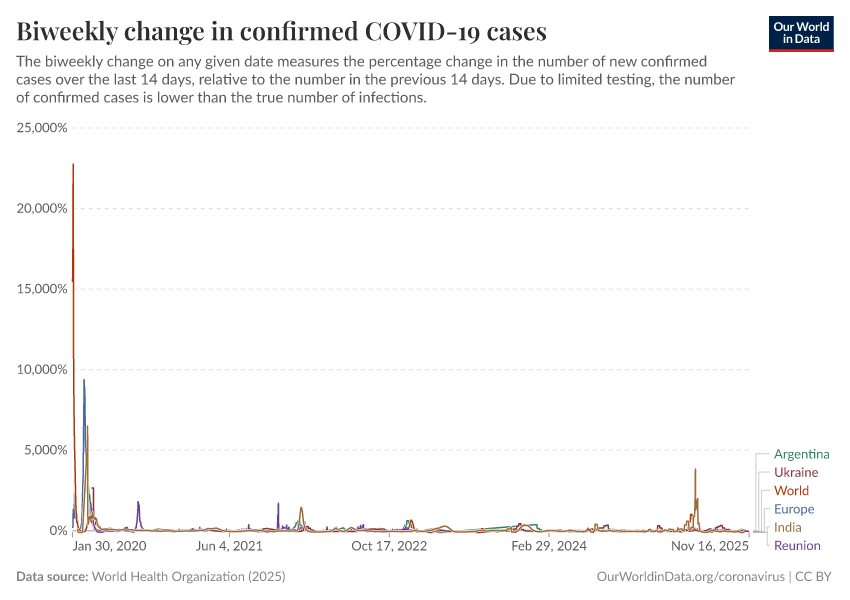 World Health Organization (2025) – processed by Our World in Data. “Biweekly change in confirmed COVID-19 cases” [dataset]. World Health Organization, “COVID-19 Dashboard WHO COVID-19 Dashboard - Daily cases and deaths” [original data]. Retrieved December 7, 2025 from https://archive.ourworldindata.org/20251207-063327/grapher/biweekly-growth-covid-cases.html (archived on December 7, 2025).