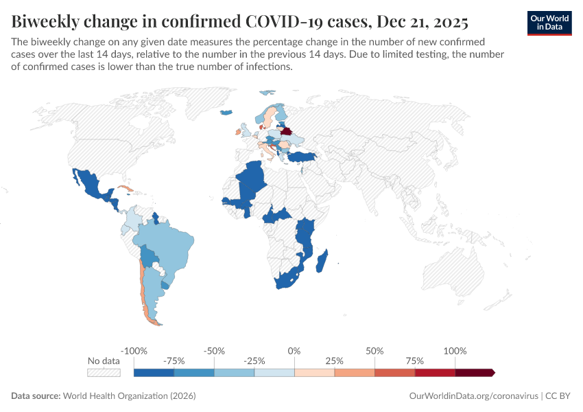World Health Organization (2026) – processed by Our World in Data. “Biweekly change in confirmed COVID-19 cases” [dataset]. World Health Organization, “COVID-19 Dashboard WHO COVID-19 Dashboard - Daily cases and deaths” [original data]. Retrieved January 14, 2026 from https://archive.ourworldindata.org/20260113-063322/grapher/biweekly-growth-covid-cases.html (archived on January 13, 2026).