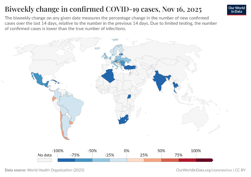 World Health Organization (2025) – processed by Our World in Data. “Biweekly change in confirmed COVID-19 cases” [dataset]. World Health Organization, “COVID-19 Dashboard WHO COVID-19 Dashboard - Daily cases and deaths” [original data]. Retrieved December 7, 2025 from https://archive.ourworldindata.org/20251207-063327/grapher/biweekly-growth-covid-cases.html (archived on December 7, 2025).