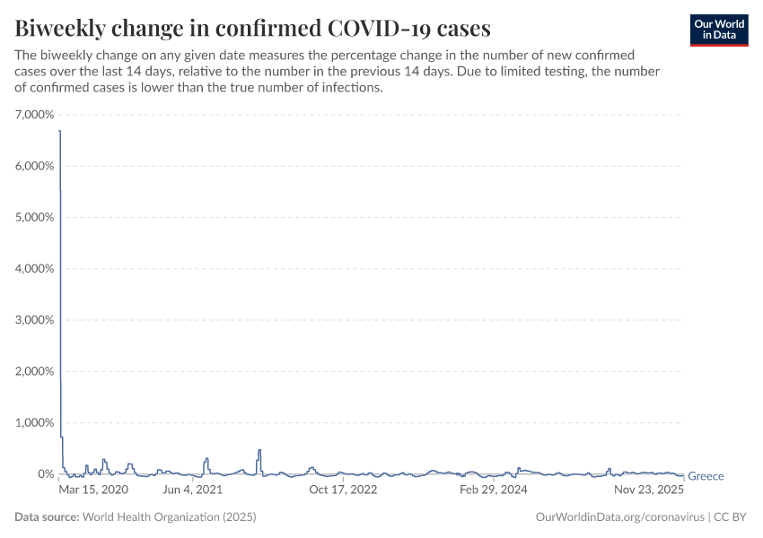 World Health Organization (2025) – processed by Our World in Data. “Biweekly change in confirmed COVID-19 cases” [dataset]. World Health Organization, “COVID-19 Dashboard WHO COVID-19 Dashboard - Daily cases and deaths” [original data]. Retrieved December 17, 2025 from https://archive.ourworldindata.org/20251217-063315/grapher/biweekly-growth-covid-cases.html (archived on December 17, 2025).