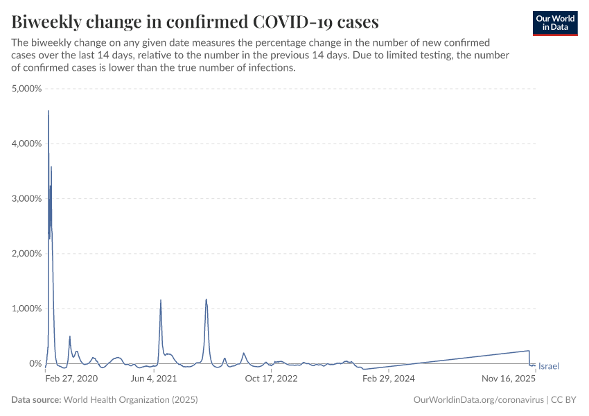 World Health Organization (2025) – processed by Our World in Data. “Biweekly change in confirmed COVID-19 cases” [dataset]. World Health Organization, “COVID-19 Dashboard WHO COVID-19 Dashboard - Daily cases and deaths” [original data]. Retrieved December 6, 2025 from https://archive.ourworldindata.org/20251205-063407/grapher/biweekly-growth-covid-cases.html (archived on December 5, 2025).