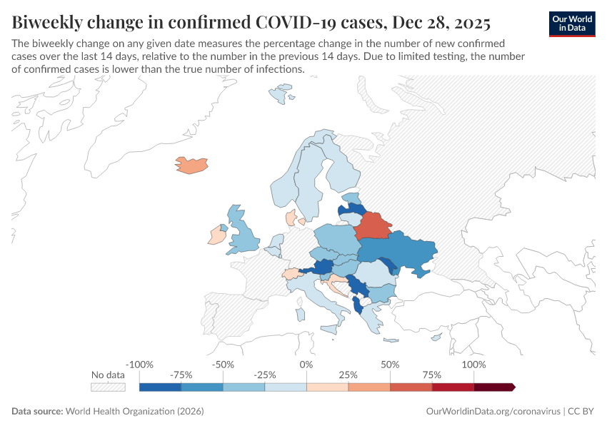 World Health Organization (2026) – processed by Our World in Data. “Biweekly change in confirmed COVID-19 cases” [dataset]. World Health Organization, “COVID-19 Dashboard WHO COVID-19 Dashboard - Daily cases and deaths” [original data]. Retrieved January 15, 2026 from https://archive.ourworldindata.org/20260115-063318/grapher/biweekly-growth-covid-cases.html (archived on January 15, 2026).