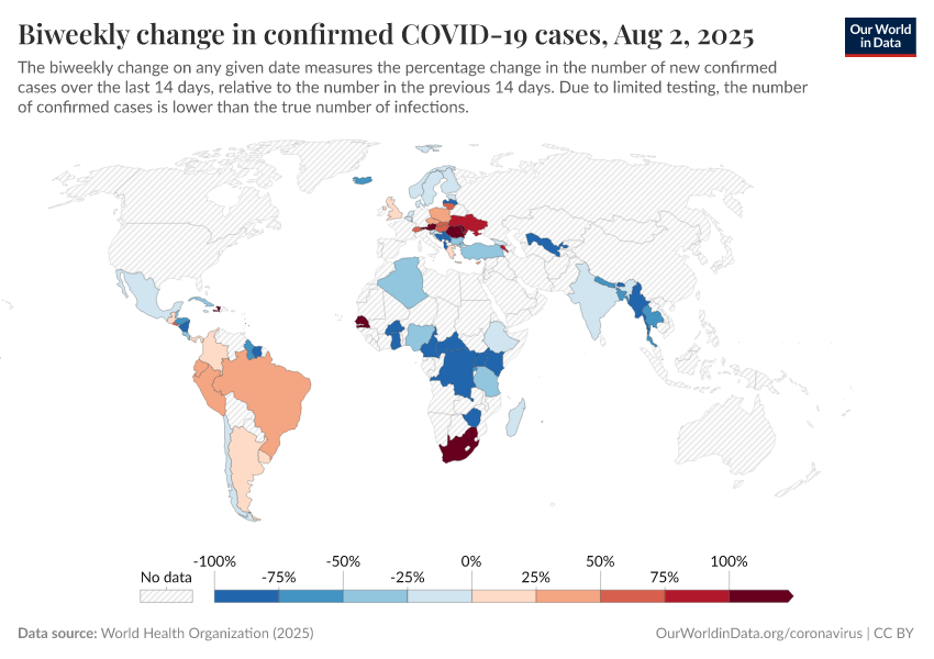 World Health Organization (2025) – processed by Our World in Data. “Biweekly change in confirmed COVID-19 cases” [dataset]. World Health Organization, “COVID-19 Dashboard WHO COVID-19 Dashboard - Daily cases and deaths” [original data]. Retrieved December 5, 2025 from https://archive.ourworldindata.org/20251205-063407/grapher/biweekly-growth-covid-cases.html (archived on December 5, 2025).