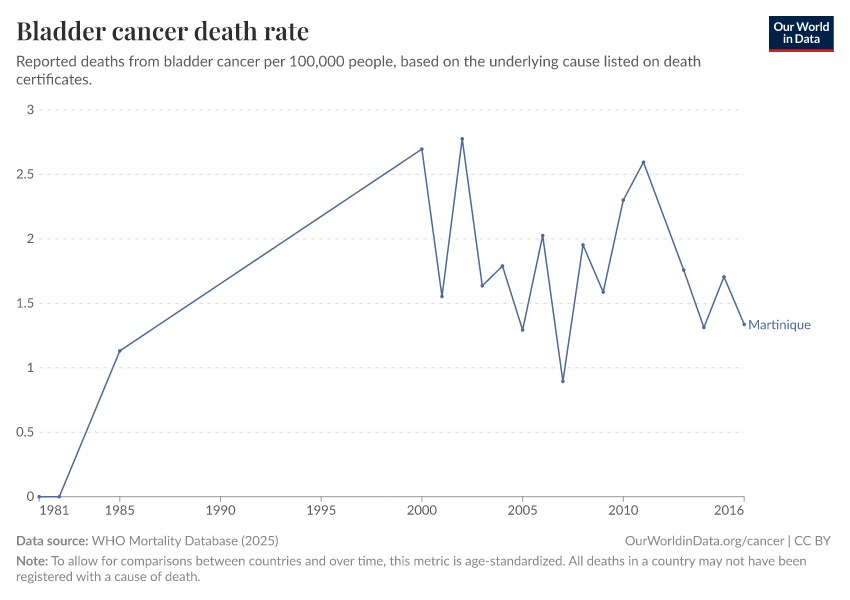 WHO Mortality Database (2025) – with minor processing by Our World in Data. “Bladder cancer death rate” [dataset]. WHO Mortality Database, “WHO Mortality Database” [original data]. Retrieved December 5, 2025 from https://archive.ourworldindata.org/20250909-093708/grapher/bladder-cancer-death-rate.html (archived on September 9, 2025).