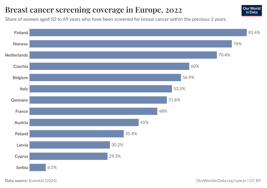 “Data Page: Breast cancer screening coverage in Europe”, part of the following publication: Saloni Dattani, Veronika Samborska, Hannah Ritchie, and Max Roser (2024) - “Cancer”. Data adapted from Eurostat. Retrieved from https://archive.ourworldindata.org/20251204-144539/grapher/breast-cancer-screening-coverage-in-europe.html [online resource] (archived on December 4, 2025).How to cite this data