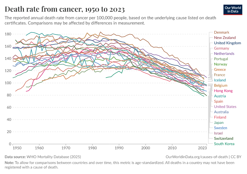 WHO Mortality Database (2025) – with minor processing by Our World in Data. “Death rate from cancer” [dataset]. WHO Mortality Database, “WHO Mortality Database” [original data]. Retrieved December 5, 2025 from https://archive.ourworldindata.org/20250909-093708/grapher/cancer-death-rate-who-mdb.html (archived on September 9, 2025).