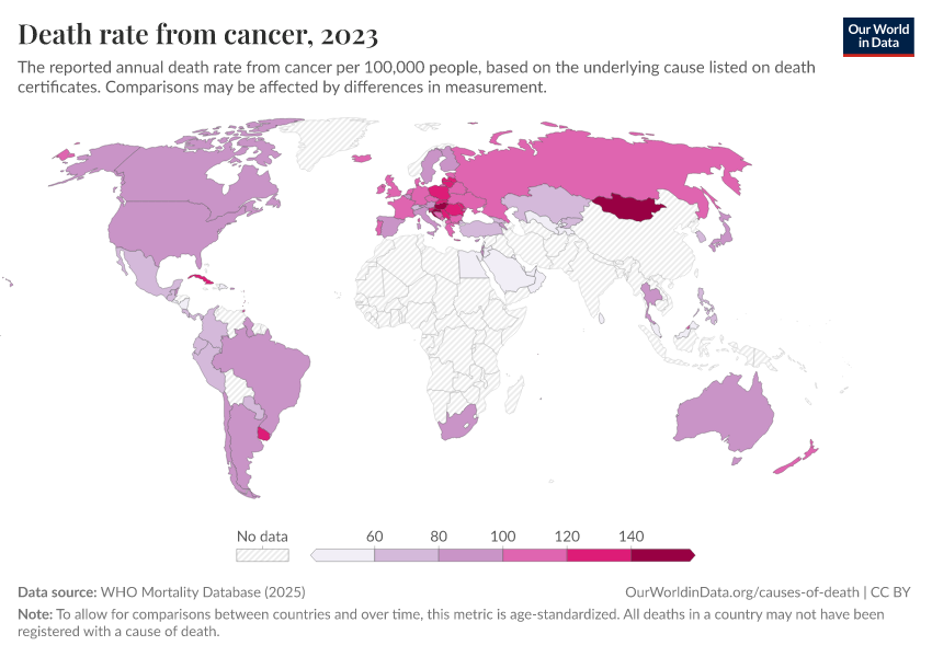 WHO Mortality Database (2025) – with minor processing by Our World in Data. “Death rate from cancer – WHO” [dataset]. WHO Mortality Database, “WHO Mortality Database” [original data]. Retrieved April 5, 2026 from https://archive.ourworldindata.org/20260319-180137/grapher/cancer-death-rate-who-mdb.html (archived on March 19, 2026).Download