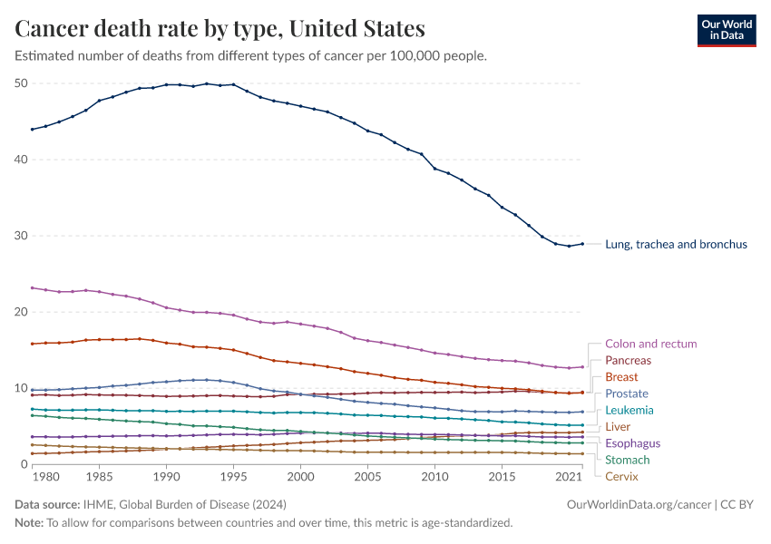 - Cancer death rates by typeWHO Mortality Database, age-standardized, reported