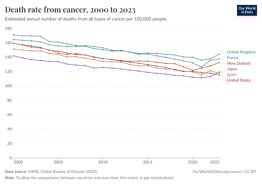 IHME, Global Burden of Disease (2025) – with major processing by Our World in Data. “Death rate from cancer – IHME” [dataset]. IHME, Global Burden of Disease, “Global Burden of Disease - Deaths” [original data]. Retrieved April 29, 2026 from https://archive.ourworldindata.org/20260428-121251/grapher/cancer-death-rates.html (archived on April 28, 2026).